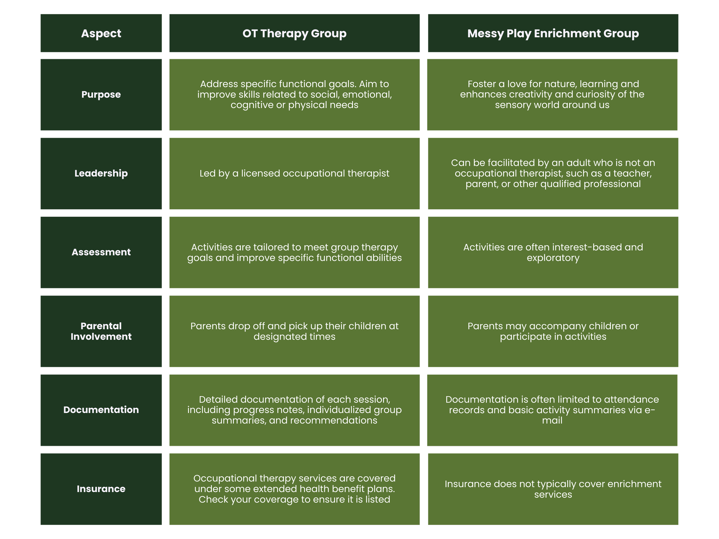Insurance: Services provided in the Messy Play Group are part of an enrichment group and do not constitute as therapy services. As such, these services are not eligible for occupational therapy insurance billing.